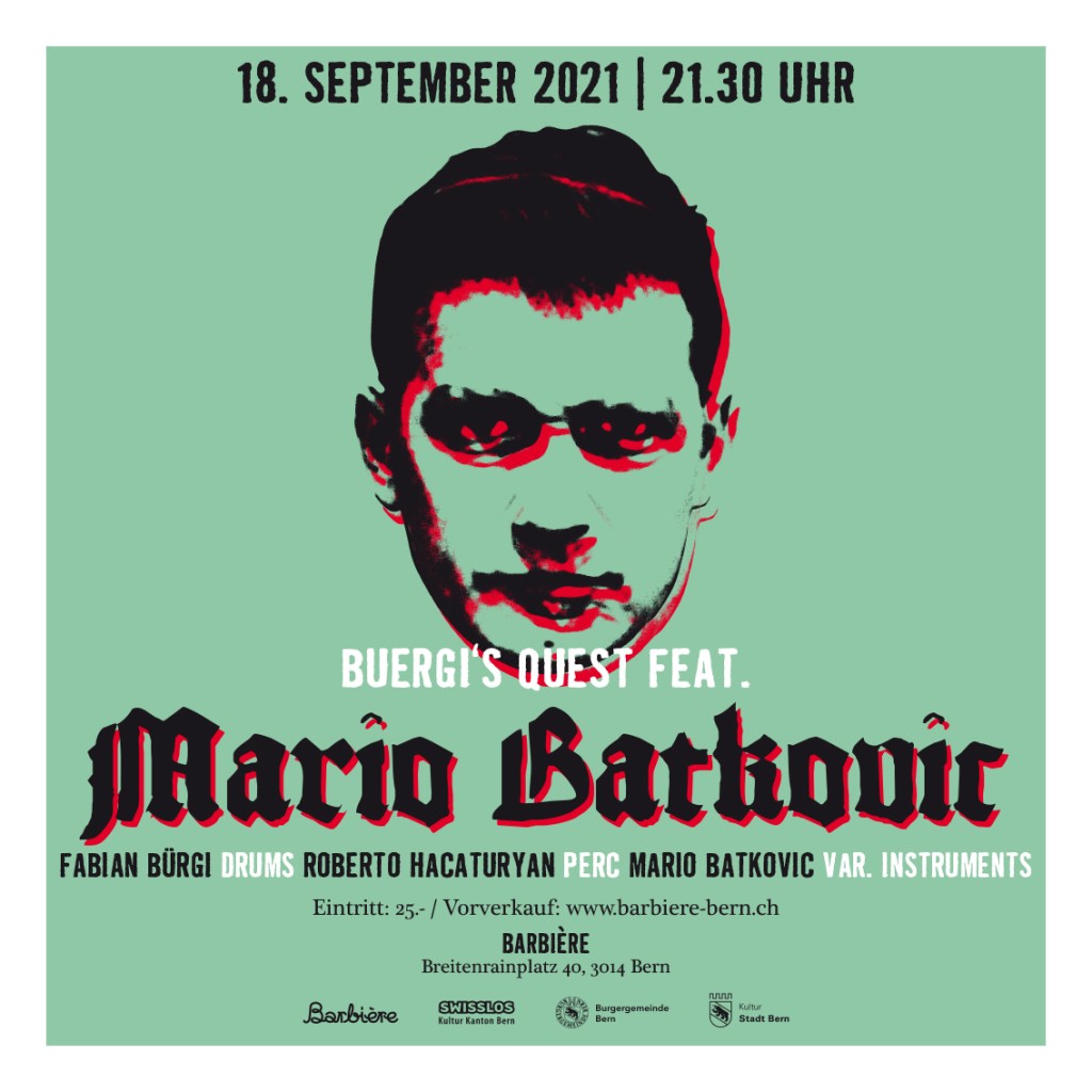 Es ist wieder soweit! Wir nehmen Schwung auf für eine weitere Konzertserie im Barbière am Breitenrainplatz. Als Eröffnung von Buergi’s Quest laden wir diesen Samstag 18.09.2021 zum zweiten Mal Mario Batkovic ein. Dieser nutzte die vergangenen Monate, um diverse elektronische Musikinstrumente zu bauen und so ein einzigartiges Instrumentarium hervorzubringen. Das muss ausprobiert werden! Mit im Boot ist der Perkussionist Roberto Hacaturyan. Zusammen werden sie neue Kompositionen von Mario spielen. Kommt vorbei!Mario Batkovic – various instrumentsRoberto Hacaturyan – percussionFabian Bürgi – drums