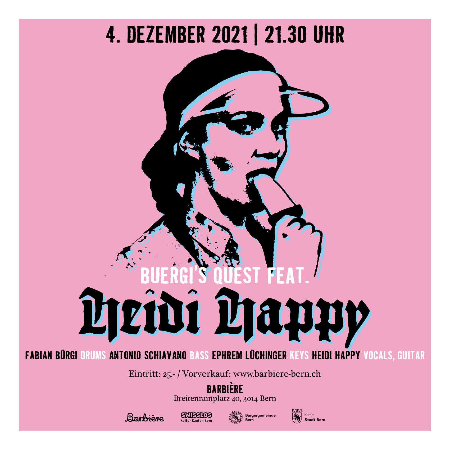 Heidi Happy lässt sich als nächster Gast auf das Experiment der Buergi’s Quest Reihe ein. Die Multiinstrumentalistin, die durch ihre unverkennbar warme Stimme bereits in diversen Soloprojekten, wie auch Kollaborationen aufhorchen liess, wird zusammen mit Fabian Bürgi, Ephrem Lüchinger und Toni Schiavano ihre vielfältigen und bewegenden Songs präsentieren. Mit ihrem verspielten Charme wird Heidi Happy die Zuhörer*innen in ihre wunderschöne verträumte Welt einzutauchen lassen.