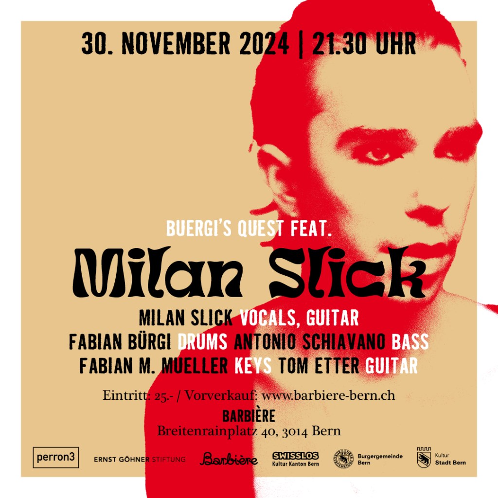 Buergi’s Quest feat. Milan Slick Milan Slick vocals, guitar Tom Etter, guitar Fabian M. Mueller, keys Toni Schiavano, bass Fabian Bürgi, drums Teilen mit: Klicke, um auf X zu teilen (Wird in neuem Fenster geöffnet) X Klick, um auf Facebook zu teilen (Wird in neuem Fenster geöffnet) Facebook Gefällt mir Wird geladen …